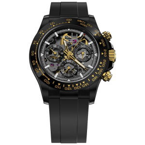 Inspired by the elusive and enigmatic presence of the Phantom, the case silhouette mirrors the flowing lines of the Phantom at the center of the dial. Roman numeral time markers are warped and radiate outward, forming an asymmetric geometric structure. Through playful reinterpretation and exaggerated transformation, this design creates a visual effect that seamlessly traverses the realms of reality and fantasy.